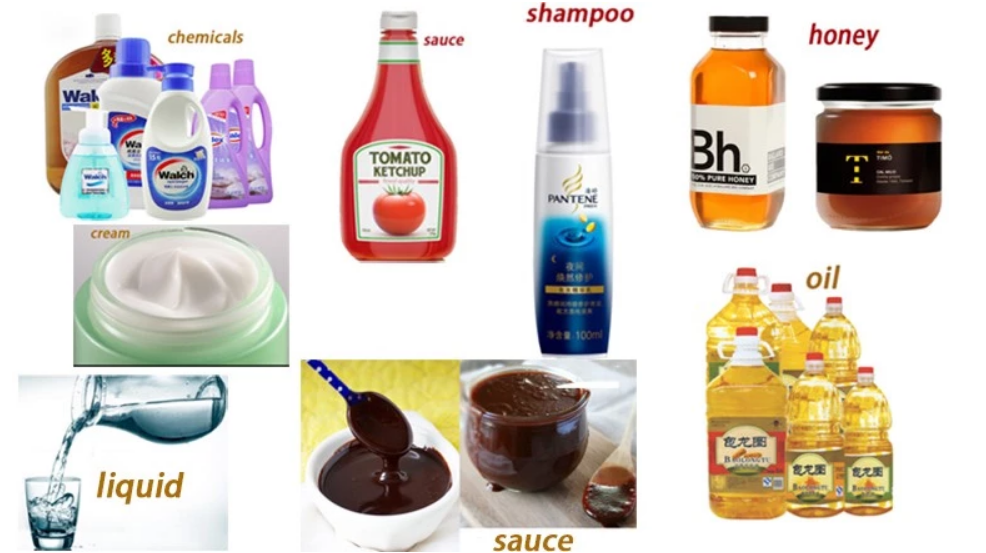 ਅਰਧ-ਲੇਸਦਾਰ ਅਤੇ ਲੇਸਦਾਰ ਤਰਲ; ਕੈਟਸੱਪ, ਸਰ੍ਹੋਂ, ਸ਼ਰਬਤ, ਸਾਲਸਾ, ਮੇਅਨੀਜ਼, ਸ਼ਹਿਦ, ਮੂੰਗਫਲੀ ਦਾ ਮੱਖਣ, ਜੈਲੀ, ਡਿੱਪਿੰਗ ਸਾਸ, ਲਿਪ ਬਾਮ, ਸ਼ੈਂਪੂ, ਸੰਘਣੇ ਸਾਬਣ, ਸਟਾਈਲਿੰਗ ਜੈੱਲ, ਚਿਹਰੇ ਦੇ ਮਾਸਕ, ਮੋਮ, ਗਲੂ, ਗਰੀਸ, ਸੀਲੈਂਟਸ, ਸਿਲੀਕੋਨ ਅਤੇ ਹੋਰ ਬਹੁਤ ਕੁਝ